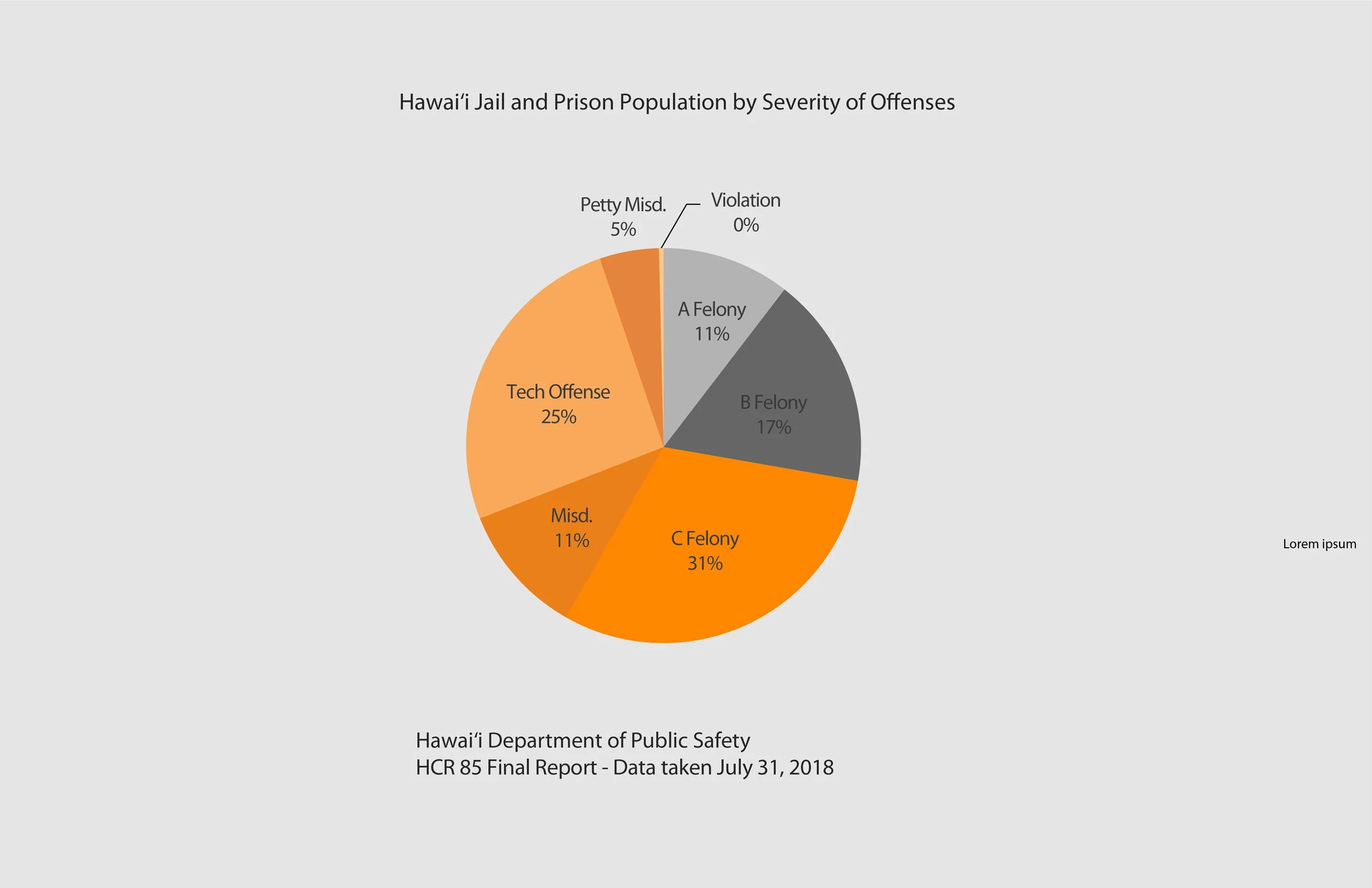 “The vast majority (72%) are incarcerated for relatively low-level offenses, i.e., class C felonies or below (misdemeanors, petty misdemeanors, technical offenses, or violations). Only 28% are serving sentences for the more serious class A and B felonies, and not all of the A and B felonies are for violent crimes, many are for drug offenses. Additionally, 53% of Hawaiʻi prisoners are classified as minimum or community custody inmates.”